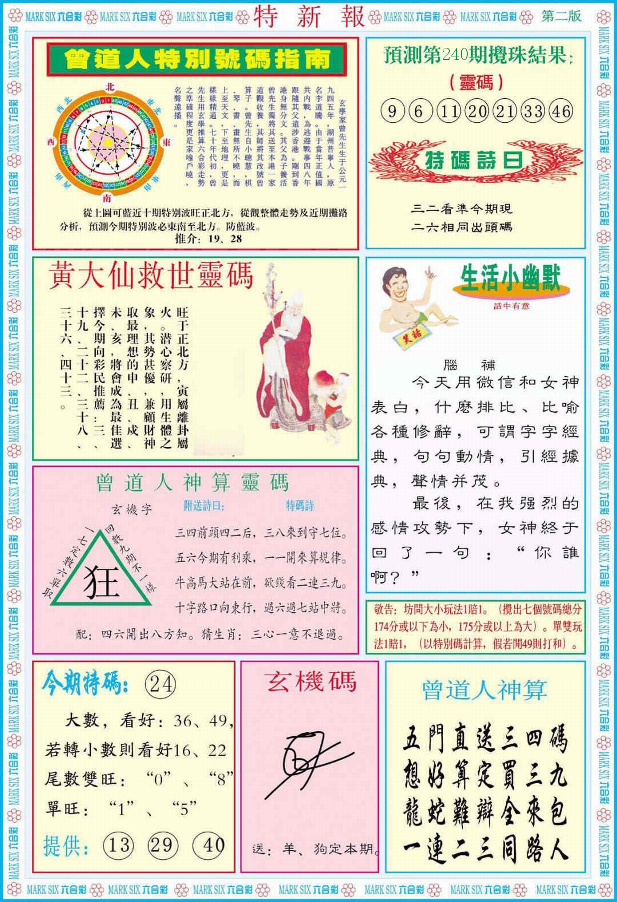 新香港六合彩 第 2025240 期 開獎結果