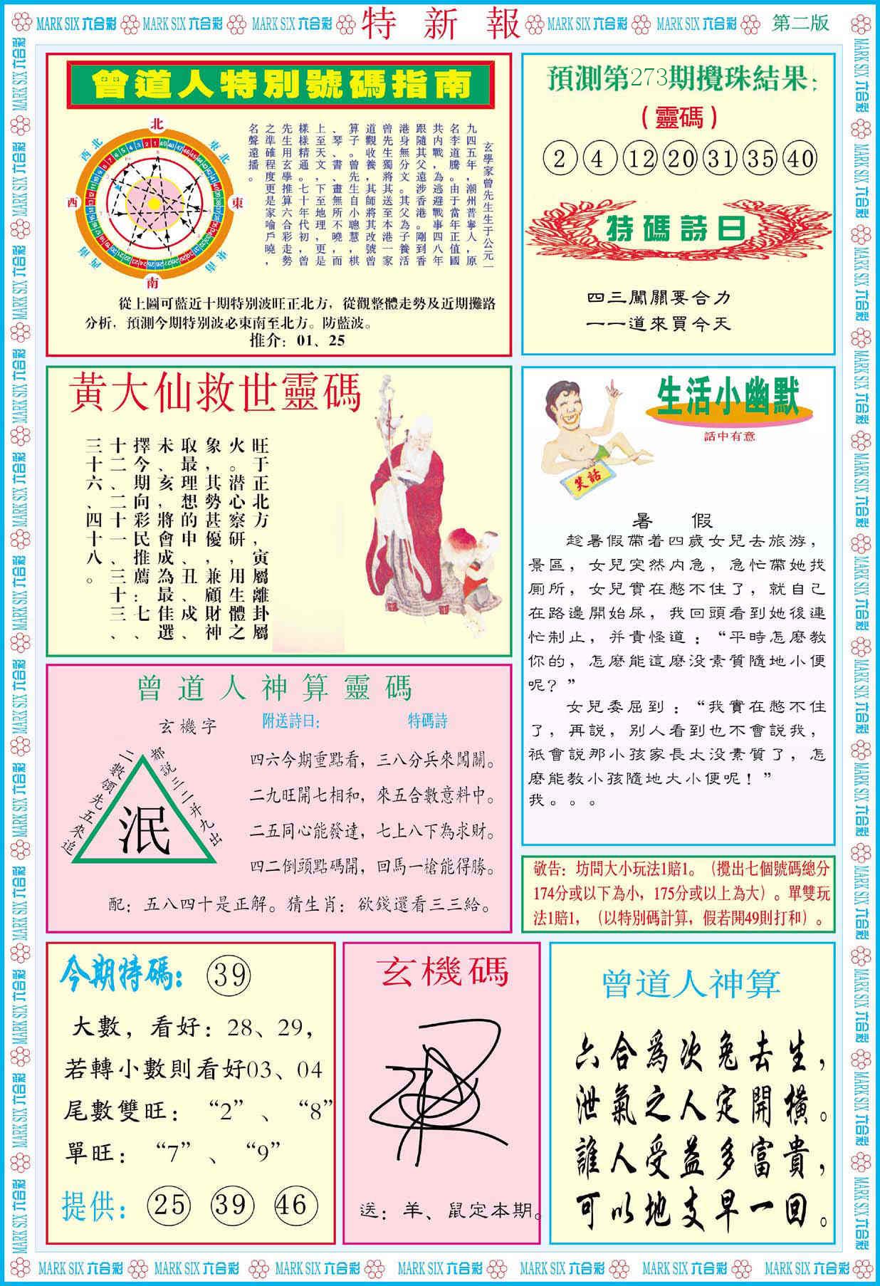 新香港六合彩 第 2025273 期 開獎結果